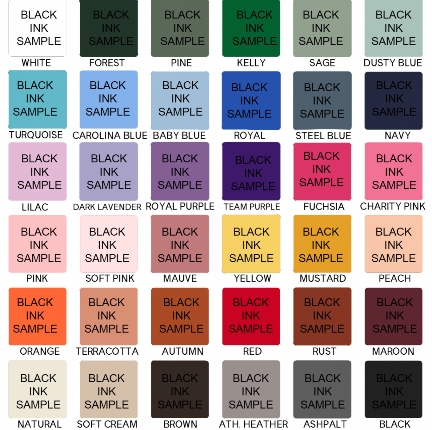 Black ink will not show on black garments; ink colors appear exactly as shown and cannot be customized, and colors may vary slightly from screen to screen as these are mockups of the final product.