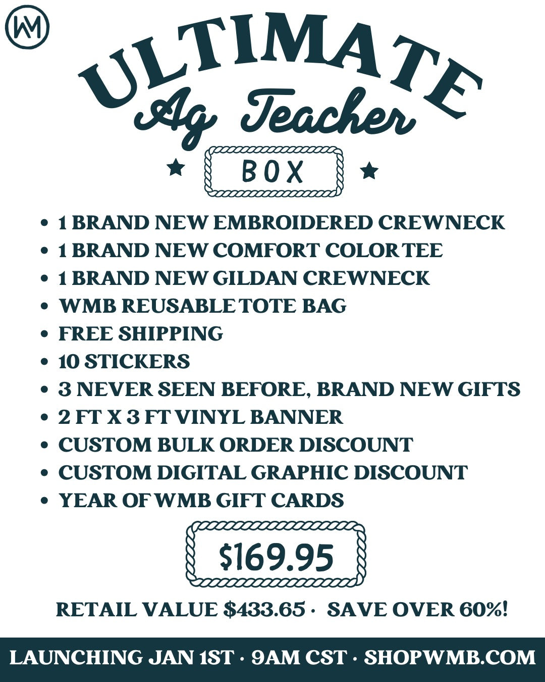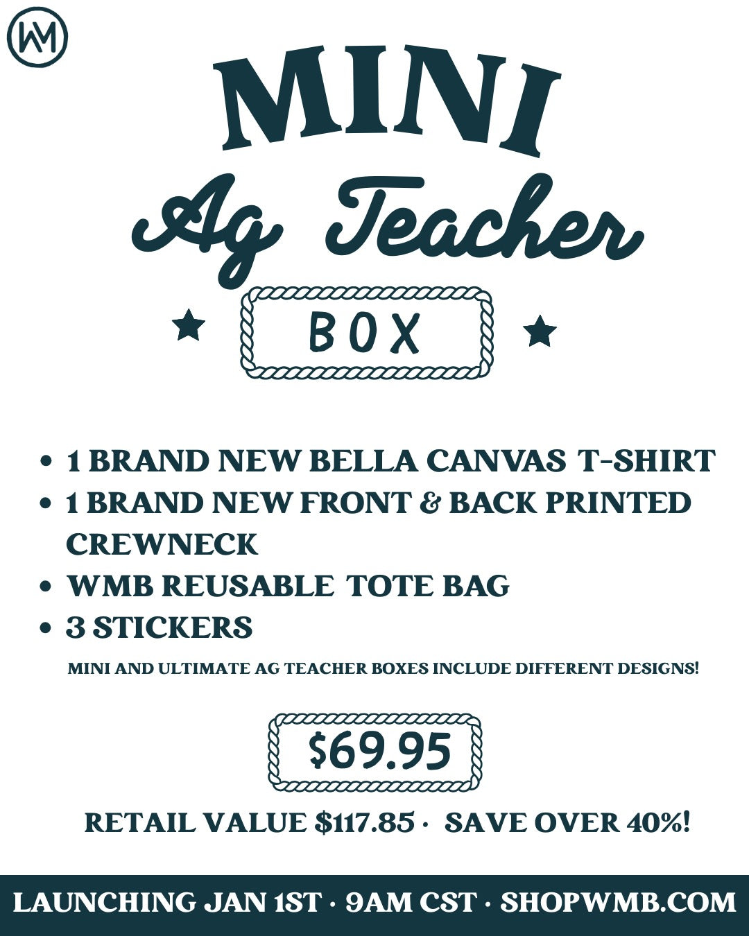 Because each box includes completely different designs and items, gifting both means they’ll receive the FULL Ag Teacher experience with tons of apparel, stickers, classroom goodies, exclusive WMB items, and more.