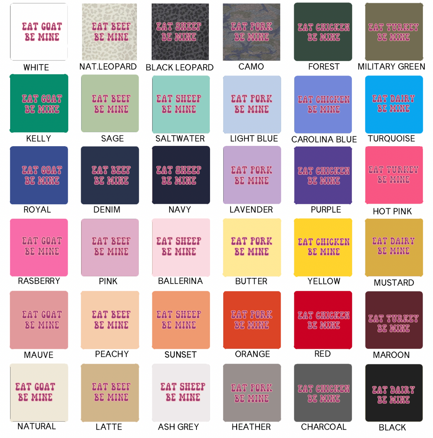Black ink will not show on black garments; ink colors appear exactly as shown and cannot be customized, and colors may vary slightly from screen to screen as these are mockups of the final product.